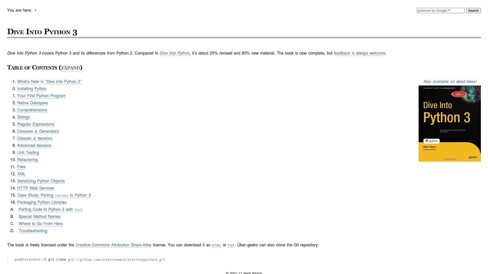Dive Into Python 3 covers Python 3 and its differences from Python 2. Compared to Dive Into Python, it’s about 20% revised and 80% new material.
